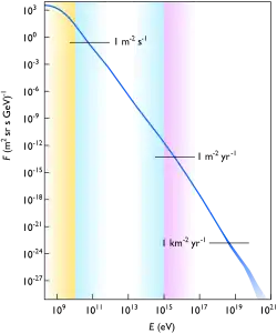 Диапазон энергий частиц в космических лучах велик — от 106 эВ до 5⋅1021 эВ[3].