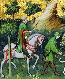 И наконец, зелёный почитался цветом пылкой юности, красоты, отваги и свободы[19]. Так, сохранившаяся опись костюмов юных сыновей Иоанна Доброго, указывает на зелёный как на «весенне-летний» цвет, из которого полагалось шить для них лёгкое платье, предназначенное для тёплого времени года, в то время как «зимними» цветами полагались алый и синий. С другой стороны, с ним ассоциировалась беспорядочная жизнь, безумие, ветреность и расточительство, в общем, любое нарушение привычного порядка[25]. В романах артуровского цикла, в зелёное постоянно одевается рыцарь Тристрам (или Тристан) Лионесский, несчастный возлюбленный королевы Изольды. Несколько французских городов, в частности, Марсель, предписывали проституткам носить зелёное платье. Однако, несмотря на все отрицательные ассоциации, с ним связанные, этот цвет стал исключительно моден в конце XIV века[19].