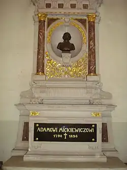 В конце XIX и в начале XX века в условиях, когда сооружение памятников деятелям польской культуры на улицах и площадях Вильны не представлялось возможным, в костёле появилось несколько памятников польским писателям. Сначала в связи со столетием со дня рождения великого польского поэта, по проекту архитектора Тадеуша Стрыенского был сооружён памятник Адаму Мицкевичу с бронзовым бюстом работы Марцелия Гуйского. Памятник Мицкевичу установлен в южном нефе в том месте, где, по преданию, любил стоять поэт. Он выполнен в форме саркофага на ножках в виде львиных лап, возвышающегося на высоком постаменте; над саркофагом в овальной нише между двумя колоннами установлен бронзовый бюст, обрамленный бронзовыми позолоченными лавровыми листьями. Колонны подпирают фриз из имитации мрамора, над ним в обрамлении из лавровых листьев копия образа Матери Божией Остробрамской. Памятник, сооружённый на собранные общественностью средства (4648,39 рублей[14]), был открыт 6 (18) июня 1899 года.