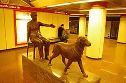 Одна из особенностей архитектурного оформления станции — расположенная на ней скульптура слепого древнегреческого прорицателя Тиресия с собакой скульптора Ласло Ола Матиаша (Oláh Mátyás László).[3]