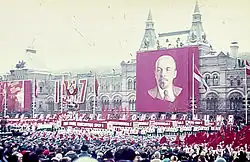 При советской власти Красная площадь стала главным идеологическим символом и центром политической жизни страны. Ещё с 1 мая 1918 года на ней проводились многочисленные парады и демонстрации. Поначалу их характер был серьёзным и траурным, направленным на чествование памяти «погибшим за дело революции». С течением времени риторика церемоний изменилась: они стали более торжественными и стремились продемонстрировать успехи и достижения нового режима. В 1919-м был проведён первый парад физкультурников, его принимал лично Владимир Ленин. Позднее марш стал ежегодным, число участников достигало нескольких тысяч человек, главным из них считался Иосиф Сталин[74].