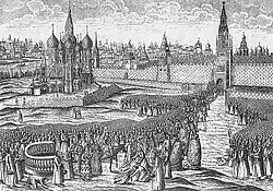 В XVI—XVIII веках Красная площадь была центром политической жизни: на неё стекался народ, обсуждались новости, проходили волнения и бунты, а с Лобного места зачитывались царские указы, в отдельных случаях рядом проводили показательные казни. 25 июля 1570 года состоялась самая массовая из них, когда в разгар «опричного террора» по подозрению в заговоре Иван Грозный приказал казнить больше ста бояр. В 1671-м у Лобного места отсекли голову Степану Разину, а после обоих стрелецких бунтов по несколько лет на Красной площади стояли виселицы. В 1768 году на эшафоте отбывала «поносительное зрелище» Дарья Салтыкова: прикованная к столбу, она стояла под табличкой «мучительница и душегубица»[46].