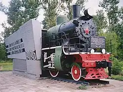 Представляет собой переднюю часть паровоза СУ 208-64 слитую с белым бетонным постаментом в виде крыльев.