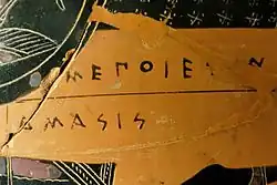 Благодаря подписям на вазах известны имена порядка сорока аттических вазописцев. Помимо имени художника на сосуде обычно стоит др.-греч. ἐγραψεν (égrapsen — «нарисовал»). К подписи гончара обычно добавлялось др.-греч. ἐποίησεν (epoíesen — «сделал»). Подписи гончаров встречаются почти в два раза чаще, чем подписи вазописцев[9]. Первые подписи датируются 580 г. до н. э.[10] Подписи на керамике с гордостью часто проставляли вазописцы-пионеры[11].