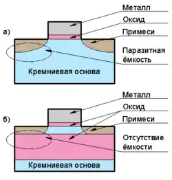 5. Хотя технология КНИ может быть использована для построения любых полупроводниковых приборов, чаще всего речь идёт о МОП-транзисторах, характерным размером которых является длина канала, и именно эта величина указывается в наименовании технологического процесса