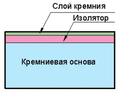 Подложка, выполненная по технологии кремний на изоляторе, представляет собой трёхслойный пакет, который состоит из монолитной кремниевой пластины, диэлектрика и размещённого на нём тонкого поверхностного слоя кремния. В качестве диэлектрика может выступать диоксид кремния SiO2 или, гораздо реже, сапфир (в этом случае технология называется «кремний на сапфире» или КНС)[1]. Дальнейшее производство полупроводниковых приборов с использованием полученной подложки по своей сути практически ничем не отличается от классической технологии, где в качестве подложки используется монолитная кремниевая пластина.
