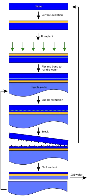 Процесс Smart Cut — сращивание двух пластин и использование ионной имплантации водорода для проведения скалывания на заданной глубине