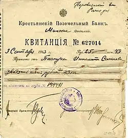 Квитанция Минского отделения Крестьянского поземельного банка, 1913 год