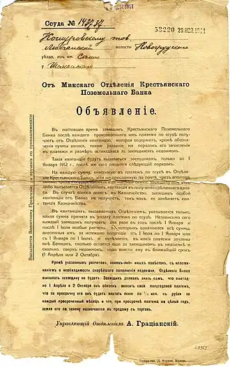Расчет по ссуде в Минском отделении Крестьянского поземельного банка