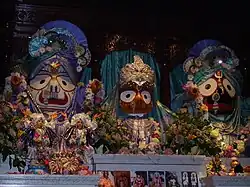 В храмовых мурти Кришна изображается стоящим в расслабленной позе в окружении своих спутников — своего брата Баларамы (также известном как Балабхадра), сестры Субхадры или с основными своими жёнами-царицами Рукмини и Сатьябхамой. Часто Кришна изображается вместе со своей возлюбленной гопи Радхой как Радха-Кришна — образ, характерный для ряда традиций в индуизме. Например, манипурские вайшнавы никогда не поклоняются одному Кришне, а всегда только Радха-Кришне[25]. Эта форма поклонения также является отличительной чертой гаудия-вайшнавизма, рудра-сампрадаи[26] и традиции пуштимарга[27][28].