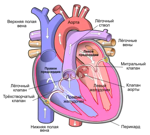Большой круг кровообращения снабжает насыщенной кислородом кровью органы и ткани. Правое предсердие сокращается одновременно с правым и толкает кровь в левый желудочек. Из левого желудочка кровь поступает в аорту. Аорта разветвляется на артерии и артериолы, идущие в различные части организма и заканчивающиеся капиллярной сетью в органах и тканях. Циркуляция крови в этом направлении регулируется предсердно-желудочковой перегородкой, двустворчатым (митральным) клапаном и клапаном аорты.