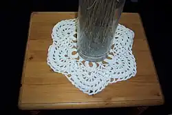 Салфетки, как и другие предметы домашнего обихода, могут быть сделаны путем вязания крючком рядов по сетке с использованием техники, называемой филейным вязанием, аналогично точкам в декартовой системе координат .