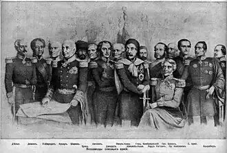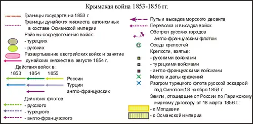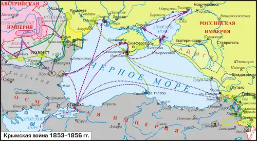 Кры́мская война́ 1853—1856 годо́в (тур. Kırım Savaşı; англ. The Crimean War; фр. la guerre de Crimée), или Восто́чная война́ (англ. The Eastern War; фр. la guerre d’Orient) — глобальный военный конфликт между Российской империей при дружественном нейтралитете со стороны Соединённых Штатов Америки, Персии и империи Цин с одной стороны, и коалицией в составе Британии, Французской, Османской империй и Сардинского королевства, при дружественном нейтралитете со стороны Австрийской империи, Королевства Пруссии и Шведско-норвежской унии, с другой. В самой России до начала XX века использовалось «французское» название «Восточная война», а также «Турецкая война», пока не было принято общеупотребительное (во всём мире) обозначение «Крымская война»[10]. Боевые действия разворачивались на Кавказе, в Закавказье, Дунайских княжествах, на Балтийском, Чёрном, Азовском, Белом и Баренцевом морях, а также в низовьях Амура, на Камчатке и Курилах[11]. Наибольшего напряжения они достигли в Крыму, поэтому в России война получила название «Крымской».