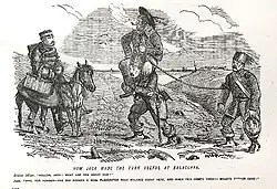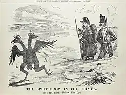 Зависимое положение, в котором оказалась Османская империя по отношению к Великобритании в тот период, иллюстрирует карикатура в лондонском журнале «Панч» (1856)[40]. На рисунке изображён английский солдат, оседлавший одного турка и держащий на привязи другого.