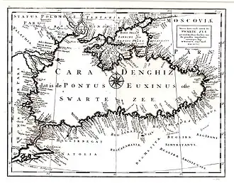 Карта черноморского региона в правление Мурада Герая, на карте отмечены, кроме прочего, Kırım Adasıтюркского — «Крымский остров») и Cara Denghiz (также с тюркского — Чёрное море). Слева от Крымского ханства (в европейской географии нового времени — Tartaria Minor) отмечена Украина, а справа — Московия. Николаас Витсен, 1682 год
