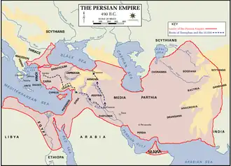 Крушение могущества демократических Афин вследствие проигранной Спарте Пелопоннесской войны в 404 году до н. э. Ксенофонт пережил уже в сознательном возрасте, и во время последовавших затем политических событий он, видимо, поддерживал реакцию. Антидемократические настроения, вероятно, и заставили его покинуть родину в 401 году до н. э. и присоединиться в качестве частного лица к экспедиции Кира Младшего[3]. После смерти Кира и вероломного убийства на переговорах греческих военачальников персами во главе с карийским сатрапом Тиссаферном Ксенофонт в числе шести вновь избранных стратегов руководил арьергардом при отступлении десяти тысяч греков через вражескую землю.