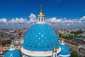 Церковь с несколькими куполами-луковицами является типичной формой русской церковной архитектуры, которая отличает её от архитектуры других православных народов и христианских конфессий. Исторически первыми примерами подобных русских церквей являются деревянный предшественник Софийского собора в Новгороде с 13-ю куполами (989)[6] и первый храм на месте каменной Десятинной церкви с 25-ю куполами[7] в Киеве (989—996). Количество куполов обычно имеет символическое значение в русской архитектуре, например, 13 куполов символизируют Христа с 12 апостолами, а 25 куполов — ещё и с 12 пророками Ветхого Завета. В сравнении с византийскими (парусными) куполами, купола русских церквей обычно меньшего размера и часто покрываются позолотой или ярко окрашиваются.