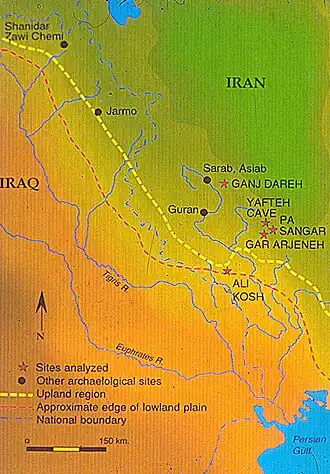 Примерно со второго тысячелетия до н. э. ираноязычные племена мигрировали в горы Загрос, смешавшись с местным населением, и в результате культурное влияние было взаимным, хотя в конечном итоге преобладал индоевропейский язык. Курды как народ сформировались примерно от двух с половиной до полутора тысяч лет назад (V в. до н. э. — V в. н. э.)[62] из множества племенных и этнических групп[63][64], в том числе куртиев, кардухов[65], мардов[55], гутиев[66], мидян[67], дейлемитов[68], хурритов, луллубеев[69], а также кадусиев[70]. Ранними областями распространения курдов, помимо собственно горной системы Загрос, являлись районы верховья Ефрата и окрестности Ванского озера на территории исторической Армении[57][71].