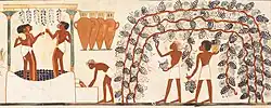 Пили египтяне и вино. В храме фараона Рамсеса II было найдено большое количество разбитых винных кувшинов, с чернильными иератическими надписями, которые указывали происхождение вина и его дополнительные характеристики, «хорошее вино восьмого раза», «вино третьего раза», «сладкое вино»[5]. Почти все виноградники того времени находились в восточной части дельты Нила (Геродот писал об отсутствии в Египте виноградной лозы, поэтому считал, что египтяне делают вино из ячменя[3]:II, 77).