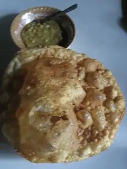 • Жареный чапати, хрустящий и покрытый пузырями, с варёным горошком (pé-byohk), популярный завтрак рядом с nan bya.