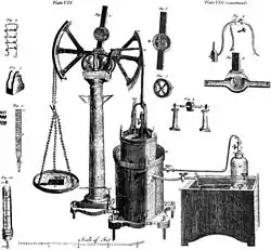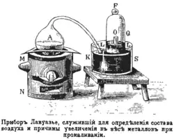 Явления тепла, тесно связанные с процессом горения, составляли также предмет изучения Лавуазье. Вместе с Лапласом, будущим творцом «Небесной механики», Лавуазье даёт начало калориметрии; они устраивают ледяной калориметр[17]. С помощью него они измеряют теплоёмкости многих тел и тепло́ты, освобождающиеся при различных химических превращениях, например при сгорании угля, фосфора, водорода, при взрыве смеси селитры, серы и угля.