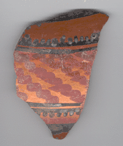 Сосуд из Котити (Kotyiti), глазировка по красному. Представляет собой промежуточный этап развития керамики от глазировки по красному до глазировки по жёлтому. Музей Максвелла, Университет Нью-Мексико. Размер квадратиков - 1 х 1 см.