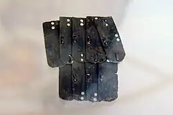 Также ламеллярные доспехи, судя по археологическим находкам, использовались в Древнем Риме, но у них пластины были соединены металлическими скобками, а не шнуром.