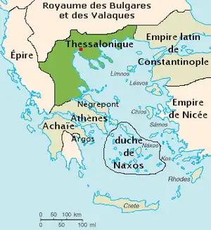 - ↑ Lognon, Jean (1950). "La reprise de Salonique par les Grecs en 1224" [The recovery of Salonica by the Greeks in 1224]. Actes du VI Congrès international des études byzantines (Paris 1948). pp. 141–146.