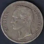 | Альфонс XII 5 испанских песет 1885 | Симон Боливар 5 венесуэльских боливаров 1912 | ||