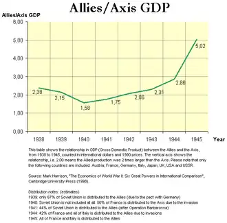 Преимущество в ВВП антигитлеровской коалиции над странами «оси» иллюстрирует следующая таблица, которая показывает ВВП основных стран — участников Второй мировой войны, с 1938 по 1945, в млрд международных долларов в ценах 1990 года[~ 1].