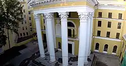 В 1952 году вышло постановление Правительства о реконструкции киностудий Москвы и Ленинграда. Перестройку «Ленфильма» поручили коллективу ленинградского филиала «Гипрокино», главным архитектором был назначен Георгий Петров. Он решил главный фасад в стиле неоклассицизма с порталом и треугольным фронтоном. Лицевые фасады с использованием ордерных форм оштукатурены, окрашены[36].