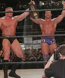 Он выбросил Гробовщика последним и выиграл матч, что гарантировало ему матч за звание чемпиона WWE на WrestleMania XIX, поскольку он был рестлером SmackDown![29]. После Royal Rumble Леснар и Крис Бенуа победили Энгла, Хааса и Бенджамина в матче с гандикапом на No Way Out 23 февраля[29]. На WrestleMania 30 марта Леснар победил Энгла и завоевал свой второй титул чемпиона WWE; во время матча он неудачно выполнил приём Shooting Star Press (приём, который он неоднократно использовал в OVW) и приземлился на голову и шею, что привело к сотрясению мозга. Это заставило Энгла (который вышел на матч со сломанной шеей) и Леснара импровизировать завершение матча.
