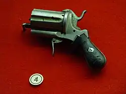 В 1836 году на основе унитарного патрона с брандтрубкой собственной конструкции Казимир Лефоше создаёт шпилечный патрон с картонной гильзой и медным донцем. В 1846 году Лефоше создал и запатентовал под шпилечный патрон т. н. «бундельревольвер» («пепербокс») — револьвер с вращающимся стволами. В 1851 году данный образец успешно демонстрировался в Лондоне.