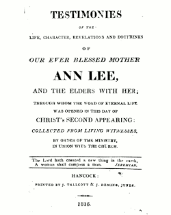 - 1 2 Stein S. J. Ann Lee // Lee, Ann (29 February 1736–08 September 1784), visionary, prophetess, and founder of the Shakers (later formally the United Society of Believers in Christ's Second Appearing) (англ.) // American National Biography Online / S. Ware — New York City: Oxford University Press, 2017. — ISSN 1470-6229 — doi:10.1093/ANB/9780198606697.ARTICLE.0100504