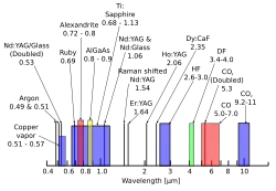 - 532 нм — зелёное излучение неодимового лазера, эффективно «пробивающее» массы воды
