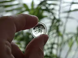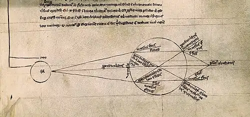 Свет преломляется сферическим стеклянным сосудом, наполненным водой. Роджер Бэкон, XIII век