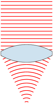 Использование линзы для изменения формы волнового фронта. Здесь плоский волновой фронт становится сферическим при прохождении через линзу