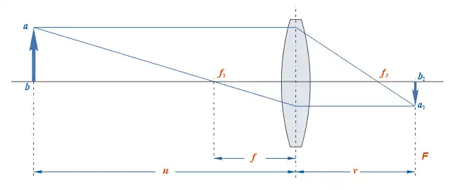 Построение линзой изображения предметов, имеющих определённую форму и размеры, получается следующим образом: допустим, линия AB представляет собой объект, находящийся на некотором расстоянии от линзы, значительно превышающем её фокусное расстояние. От каждой точки предмета через линзу пройдёт бесчисленное количество лучей, из которых, для наглядности, на рисунке схематически изображён ход только трёх лучей.