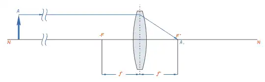 Если предмет находится на бесконечно далёком от линзы расстоянии, то его изображение получается в заднем фокусе линзы F’ действительным, перевёрнутым и уменьшенным до подобия точки.