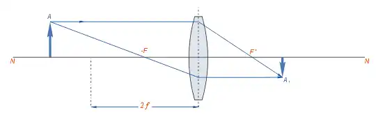 Если предмет помещён между передним фокусом и двойным фокусным расстоянием, то изображение будет получено за двойным фокусным расстоянием и будет действительным, перевёрнутым и увеличенным.