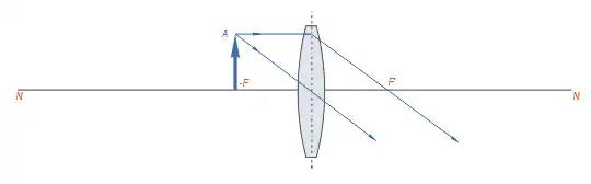 Если на некотором расстоянии перед собирательной линзой поместить светящуюся точку , то луч света, направленный по оси, пройдёт через линзу не преломившись, а лучи, проходящие не через центр, будут преломляться в сторону оптической оси и пересекутся на ней в некоторой точке , которая и будет изображением точки . Эта точка носит название сопряжённого фокуса, или просто фокуса.