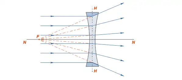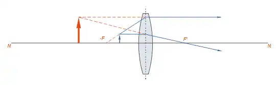Лучи, падающие на рассеивающую линзу, на выходе из неё будут преломляться в сторону краёв линзы, то есть рассеиваться. Если эти лучи продолжить в обратном направлении так, как показано на рисунке пунктирной линией, то они сойдутся в одной точке , которая и будет фокусом этой линзы. Этот фокус будет мнимым.