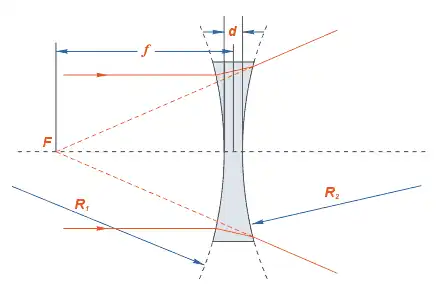 Для в этой формуле, знак радиуса положителен, если поверхность выпуклая, и отрицателен, если вогнутая. Для наоборот — положителен, если линза вогнутая, и отрицателен, если выпуклая. Если пренебрежительно мало, относительно её фокусного расстояния, то такая линза называется тонкой, и её фокусное расстояние можно найти как: