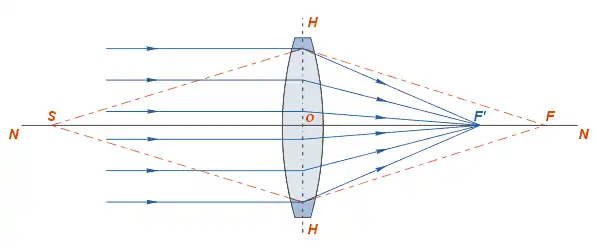 Если на линзу будет падать свет от очень удалённого источника, лучи которого можно представить идущими параллельным пучком, то на выходе из неё лучи преломляются под бо́льшим углом, и точка переместится на оптической оси ближе к линзе. При данных условиях точка пересечения лучей, вышедших из линзы, называется фокусом , а расстояние от центра линзы до фокуса — фокусным расстоянием.
