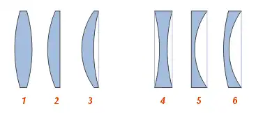 Виды линз: собирающие: 1 — двояковыпуклая; 2 — плоско-выпуклая; 3 — вогнуто-выпуклая (положительный (выпуклый) мениск); рассеивающие: 4 — двояковогнутая; 5 — плоско-вогнутая; 6 — выпукло-вогнутая (отрицательный (вогнутый) мениск)