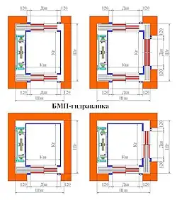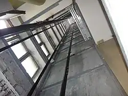 - Шахта лифта. Полностью или частично огороженное место, простирающееся от пола приямка до перекрытия. В ней перемещается кабина и, если есть, противовес. Она оборудована направляющими кабины и противовеса, дверями посадочных площадок, буферами или упорами в приямке.