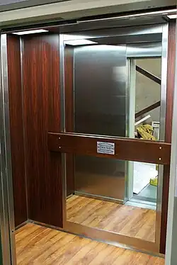 - Кабина. Перевозит пассажиров и/или другие грузы. Снаружи кабины расположены направляющие башмаки, скользящие по направляющим шахты при движении кабины и поддерживающие кабину в вертикальном положении, ловители для аварийной остановки лифта[11], отводка для воздействия на этажные переключатели при подходе к нужному этажу[12]:77—78, либо магнитный шунт для воздействия на этажный датчики селекции. У двухскоростных лифтов или лифтов с регулируемой скоростью привода на кабине установлен индукционный либо герконовый датчик точной остановки, который взаимодействует с магнитными шунтами на каждом этаже. К кабине сверху напрямую или через полиспаст с блоком прикреплены рабочие канаты подвески. У выжимного лифта канаты подвески проходят через шкивы, закреплённые под кабиной. На кабине с автоматическим дверями установлен привод дверей, отпирающий замки двери шахты и раскрывающий двери. Двери шахты собственного привода не имеют. У лифтов с распашными дверями на кабине установлена отводка, отпирающая замок двери шахты в точной остановке. Часто устанавливается электромагнит, убирающий «лыжу» отводки в движении — магнитная отводка.