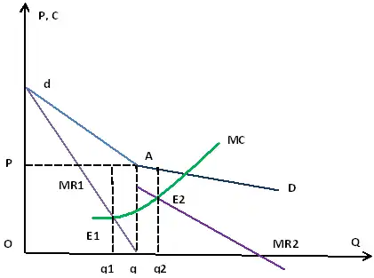 Вывернутая ломаная кривая спроса, где кривая спроса dA имеет более крутой наклон, чем участок AD, показывает, что конкуренты будут повышать цены при условии повышения цен олигополистом, но не будут стремиться снижать её в случае снижения цен олигополистом, например, в период инфляции. При вывернутой кривой спроса возможен ряд равновесных состояний: предельная выручка равна предельным затратам в точках E1 и E2 при выпуске q1 и q2[4].
