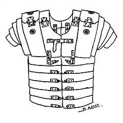 Доспехи состояли из железных полос, изнутри попарно скрепленных на груди и спине кожаными ремнями, образуя таким образом обруч, охватывающий торс солдата. Плечи, а также верхняя часть груди и спины защищались дополнительными пластинами. Нагрудные и спинные пластины крепились к основным либо крючками, либо ремнями и пряжками, располагавшимися на спине внутри доспехов, а на груди — снаружи, так что, очевидно, солдат надевал её лишь наполовину собранной и был вынужден застёгивать спереди сам. Левая и правая нагрудные пластины также соединялись между собой.