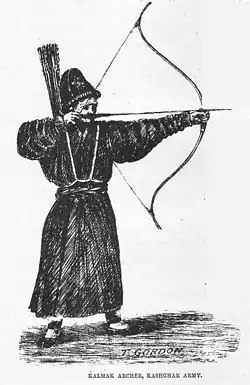 - Монголы использовали китайские пехотные луки[25] и тяжёлые стрелы и стреляли по ходу движения на полном скаку. При этом, за счёт сложения скоростей, медленная (около 30 м/с) тяжёлая стрела получала до 40 % прибавки к дальности, а её энергия удваивалась. Монгольские стрелы могли быть опасны на расстоянии в 200 м и дальше. Однако это было скорее исключение, связанное с необходимостью борьбы с китайскими пешими лучниками и арбалетчиками.